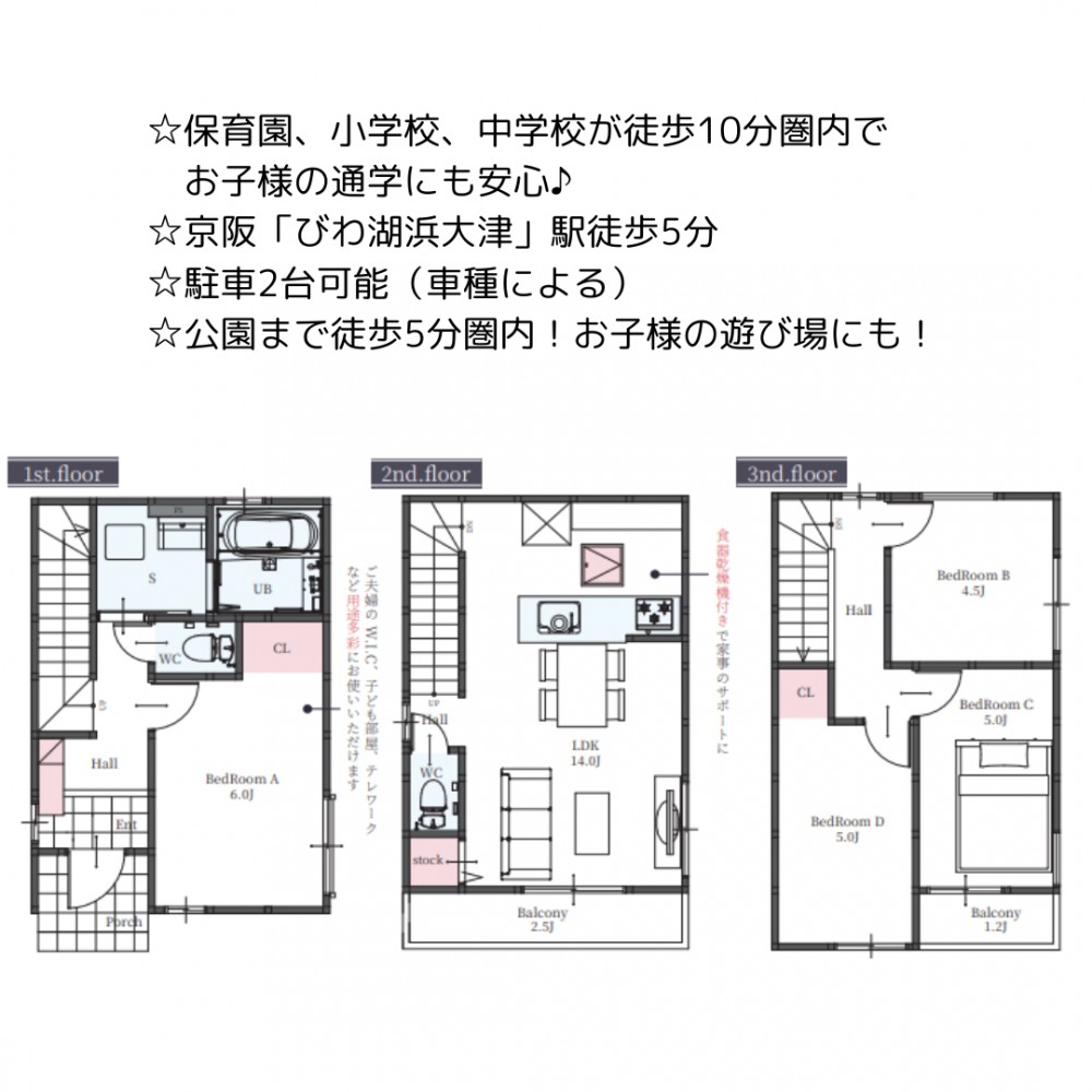 セールスポイント | ☆保育園、小学校、中学校が徒歩10分圏内でお子様の通学にも安心♪ ☆京阪「びわ湖浜大津」駅徒歩5分 ☆駐車2台可能(車種による) ☆公園まで徒歩5分圏内!お子様の遊び場にも! |