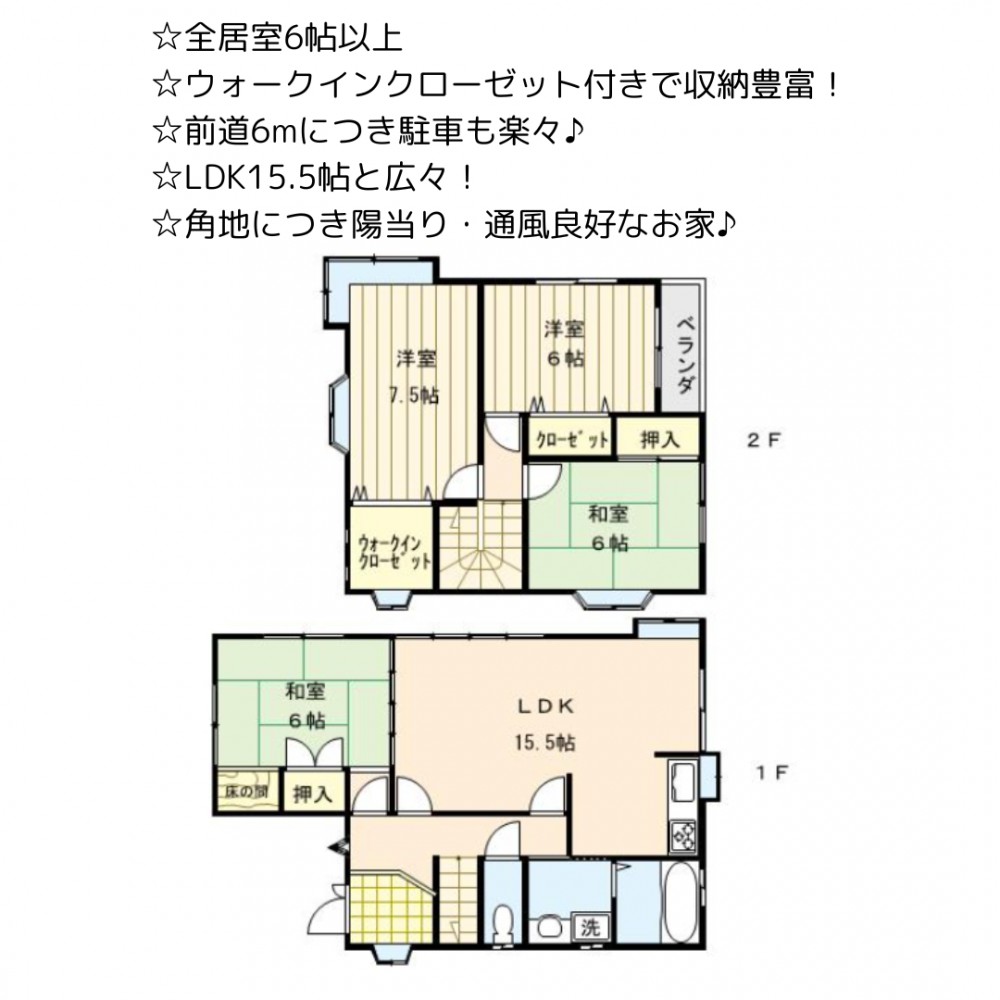 | セールスポイント | ☆全居室6帖以上 ☆ウォークインクローゼット付きで収納豊富! ☆前道6mにつき駐車も楽々♪ ☆LDK15.5帖と広々! ☆角地につき陽当り・通風良好なお家♪ |