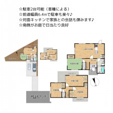 | セールスポイント | ☆駐車2台可能(車種による) ☆前道幅員6.4mで駐車も楽々♪ ☆対面キッチンで家族との会話も弾みます♪ ☆南側がお庭で日当たり良好 |
