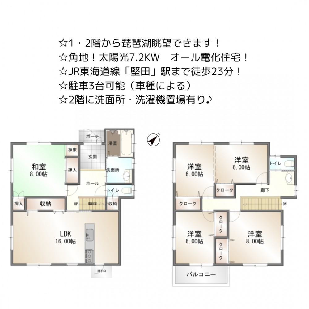 | セールスポイント | ☆1・2階から琵琶湖眺望できます! ☆角地!太陽光7.2KW オール電化住宅! ☆JR東海道線「堅田」駅まで徒歩23分! ☆駐車3台可能(車種による) ☆2階に洗面所・洗濯機置場有り♪ ☆南東側庭あり! |