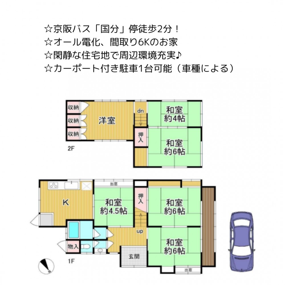 | セールスポイント | ☆京阪バス「国分」停徒歩2分! ☆オール電化、間取り6Kのお家 ☆閑静な住宅地で周辺環境充実♪ ☆カーポート付き駐車1台可能(車種による) |
