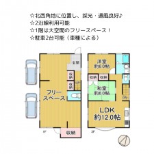 | セールスポイント | ☆北西角地に位置し、採光・通風良好♪ ☆2沿線利用可能 ☆1階は大空間のフリースペース! ☆駐車2台可能(車種による) |