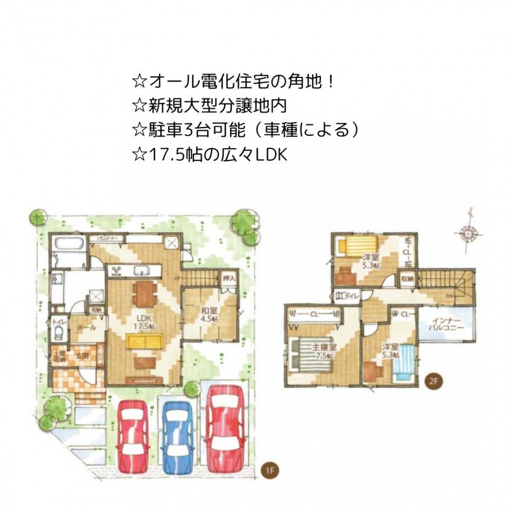 | セールスポイント | ☆オール電化住宅の角地! ☆新規大型分譲地内 ☆駐車3台可能(車種による) ☆17.5帖の広々LDK |