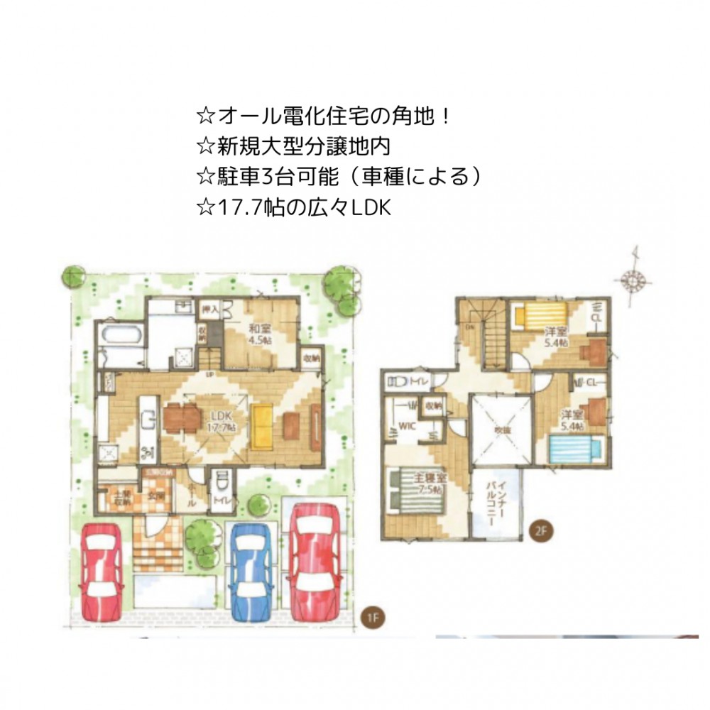 | セールスポイント | ☆オール電化住宅の角地! ☆新規大型分譲地内 ☆駐車3台可能(車種による) ☆17.7帖の広々LDK |