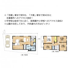 | セールスポイント | ☆「京都」駅まで約9分、「大阪」駅まで約40分と主要都市へのアクセス良好! ☆中学校は徒歩7分と近く、保育園や小学校へのアクセス良好♪ ☆公園が点在しており、子供連れの方はピッタリ |