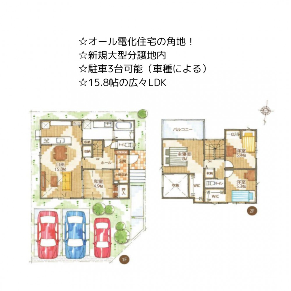 | セールスポイント | ☆オール電化住宅の角地! ☆新規大型分譲地内 ☆駐車3台可能(車種による) ☆15.8帖の広々LDK |