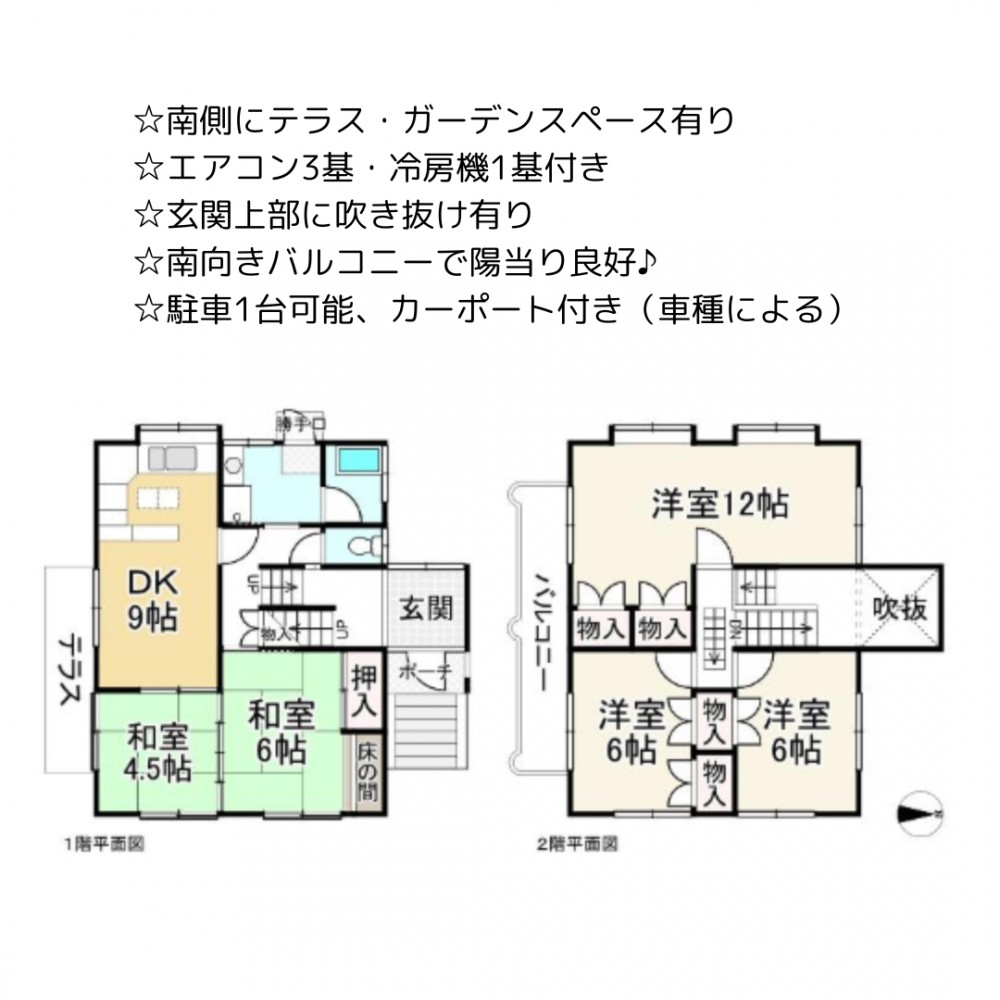 | セールスポイント | ☆南側にテラス・ガーデンスペース有り ☆エアコン3基・冷房機1基付き ☆玄関上部に吹き抜け有り ☆南向きバルコニーで陽当り良好♪ ☆駐車1台可能、カーポート付き(車種による) |