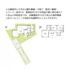 | セールスポイント | ☆分譲地内に大きな公園を整備!子育て・散歩に最適! ☆スーパー徒歩1分・薬局徒歩3分で日用品の買い物も楽々♪ ☆石山小学校徒歩13分・幼稚園徒歩10分で安心の通学環境 ☆広々バルコニーで布団や洗濯物をたくさん干せます♪ |