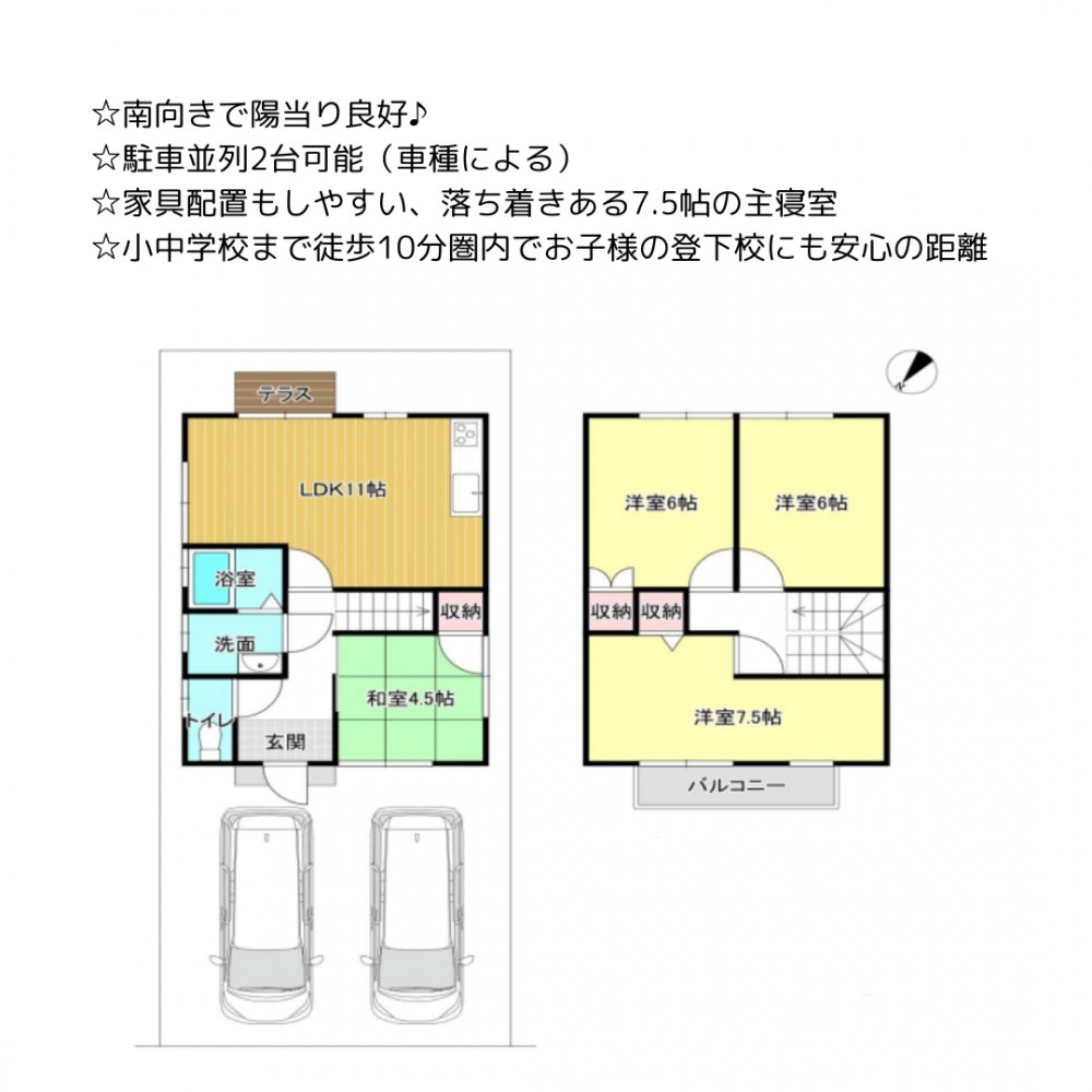 | セールスポイント | ☆南向きで陽当り良好♪ ☆駐車並列2台可能(車種による) ☆家具配置もしやすい、落ち着きある7.5帖の主寝室 ☆小中学校まで徒歩10分圏内でお子様の登下校にも安心の距離 【2026年2月リフォーム完了予定】 ・全室クロス、洗面室トイレCF張替 ・1階ウッドフロア上張 ・和室畳、キッチン、システムバス、洗面台、トイレ、洗濯パン、インターホン、コンセントプレート交換 ・ハウスクリーニング |