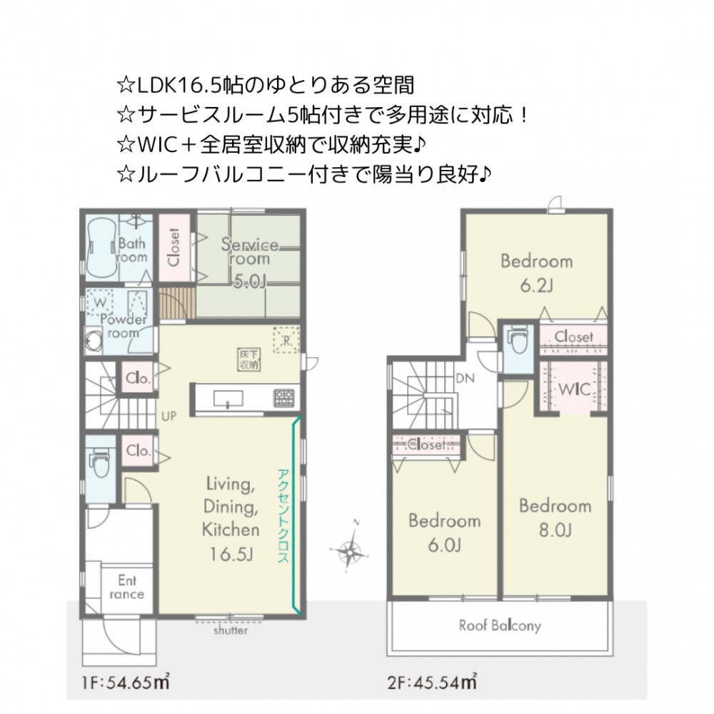| セールスポイント | ☆LDK16.5帖のゆとりある空間 ☆サービスルーム5帖付きで多用途に対応! ☆WIC+全居室収納で収納充実♪ ☆ルーフバルコニー付きで陽当り良好♪ |