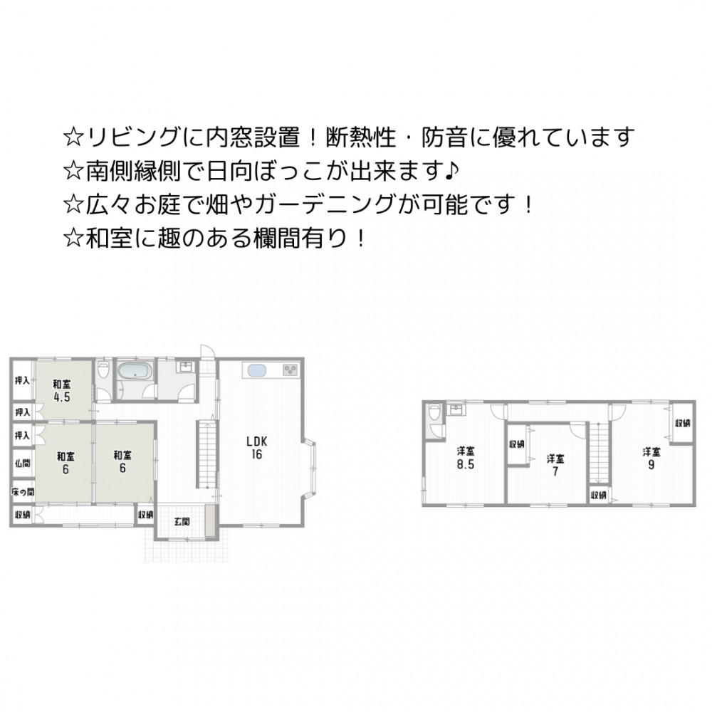 | セールスポイント | ☆リビングに内窓設置!断熱性・防音に優れています ☆南側縁側で日向ぼっこが出来ます♪ ☆広々お庭で畑やガーデニングが可能です! ☆和室に趣のある欄間有り! |