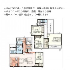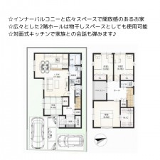 | セールスポイント | ☆カースペース並列3台駐車可能(車種による) ☆50坪超の広々とした敷地面積 ☆土間収納、パントリー、ワイド洗面台等採用の高仕様物件! ☆対側が角地のため広々とした前面道路 |