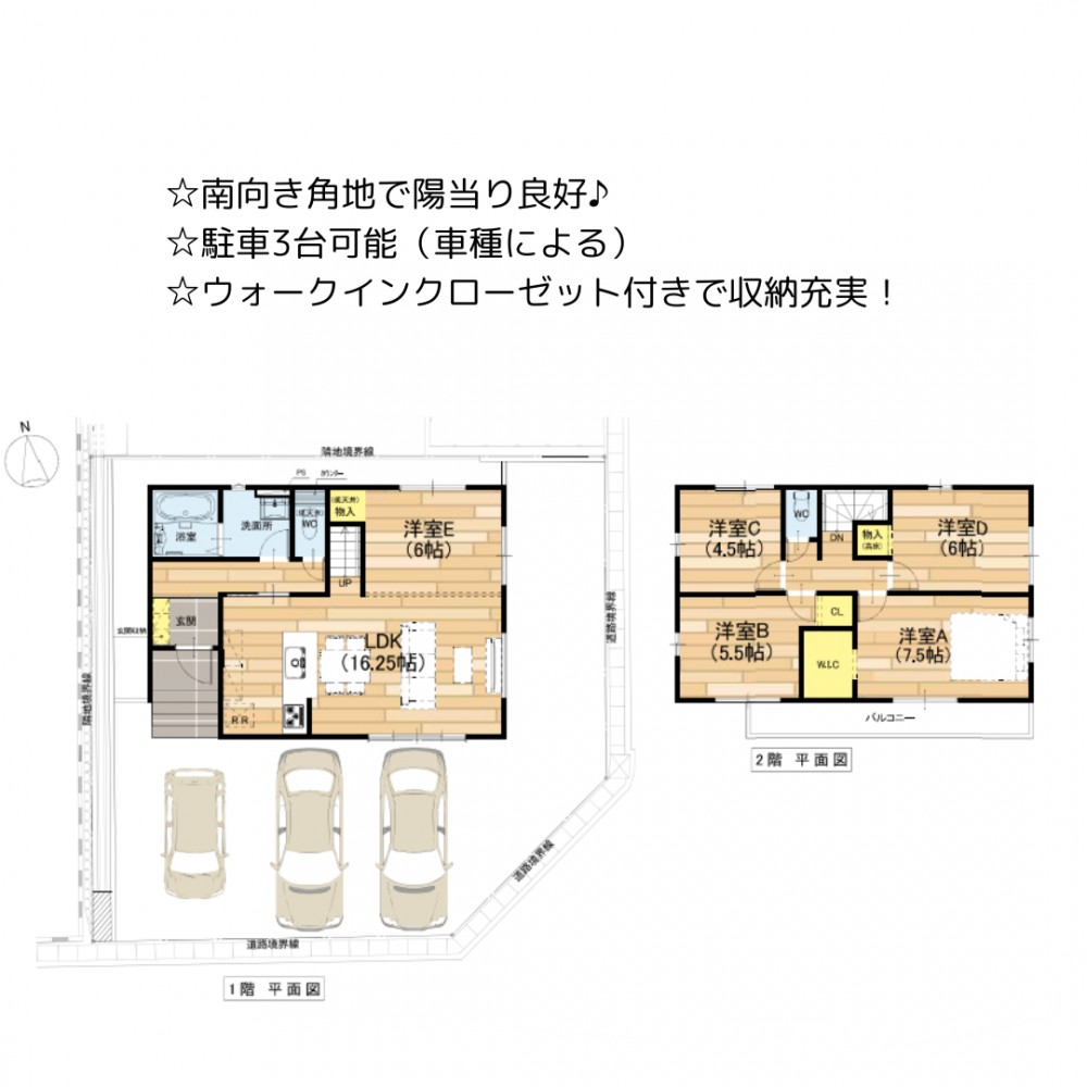 | セールスポイント | ☆南向き角地で陽当り良好♪ ☆駐車3台可能(車種による) ☆ウォークインクローゼット付きで収納充実! |