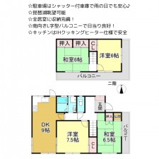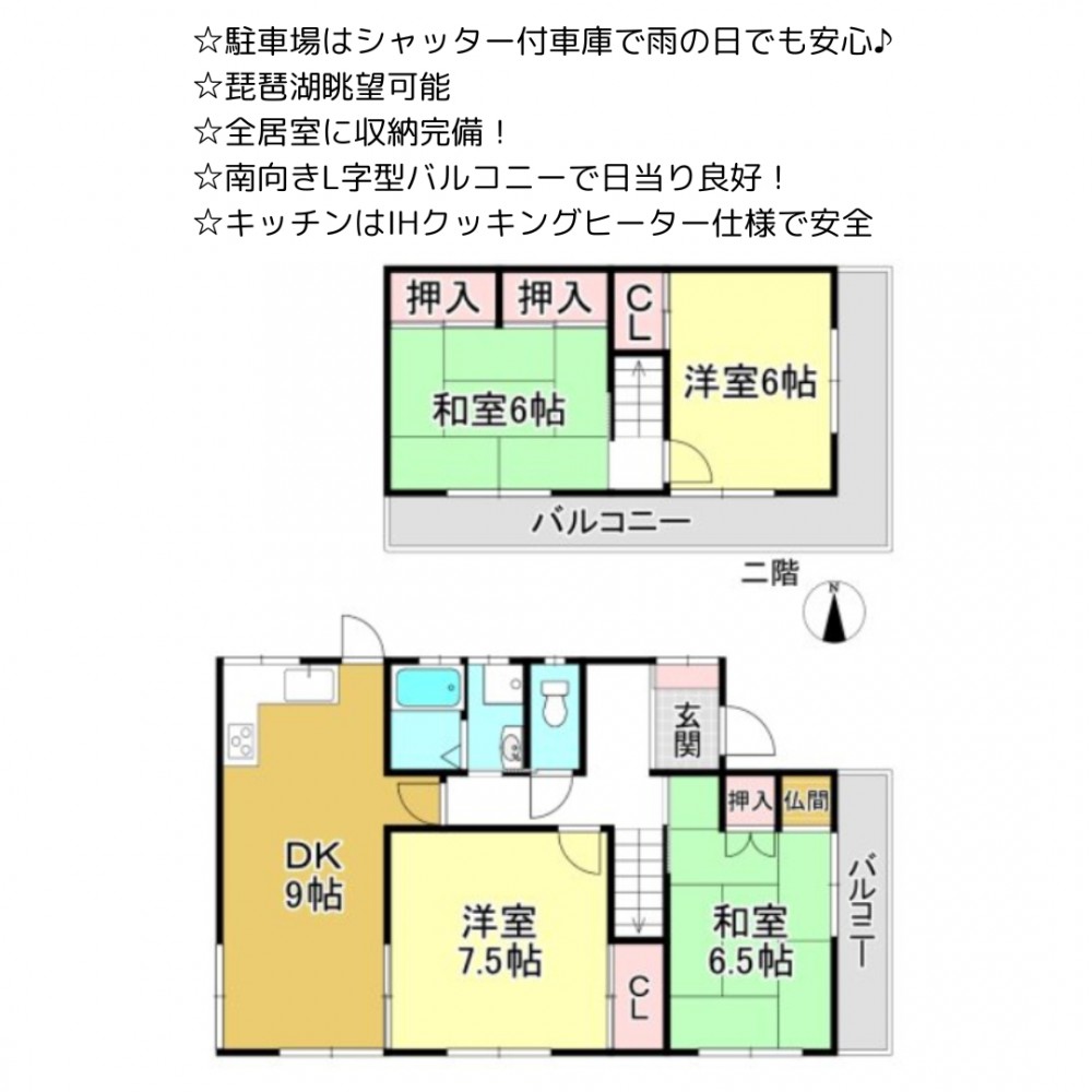 | セールスポイント | ☆駐車場はシャッター付車庫で雨の日でも安心♪ ☆琵琶湖眺望可能 ☆全居室に収納完備! ☆南向きL字型バルコニーで日当り良好! ☆キッチンはIHクッキングヒーター仕様で安全 |