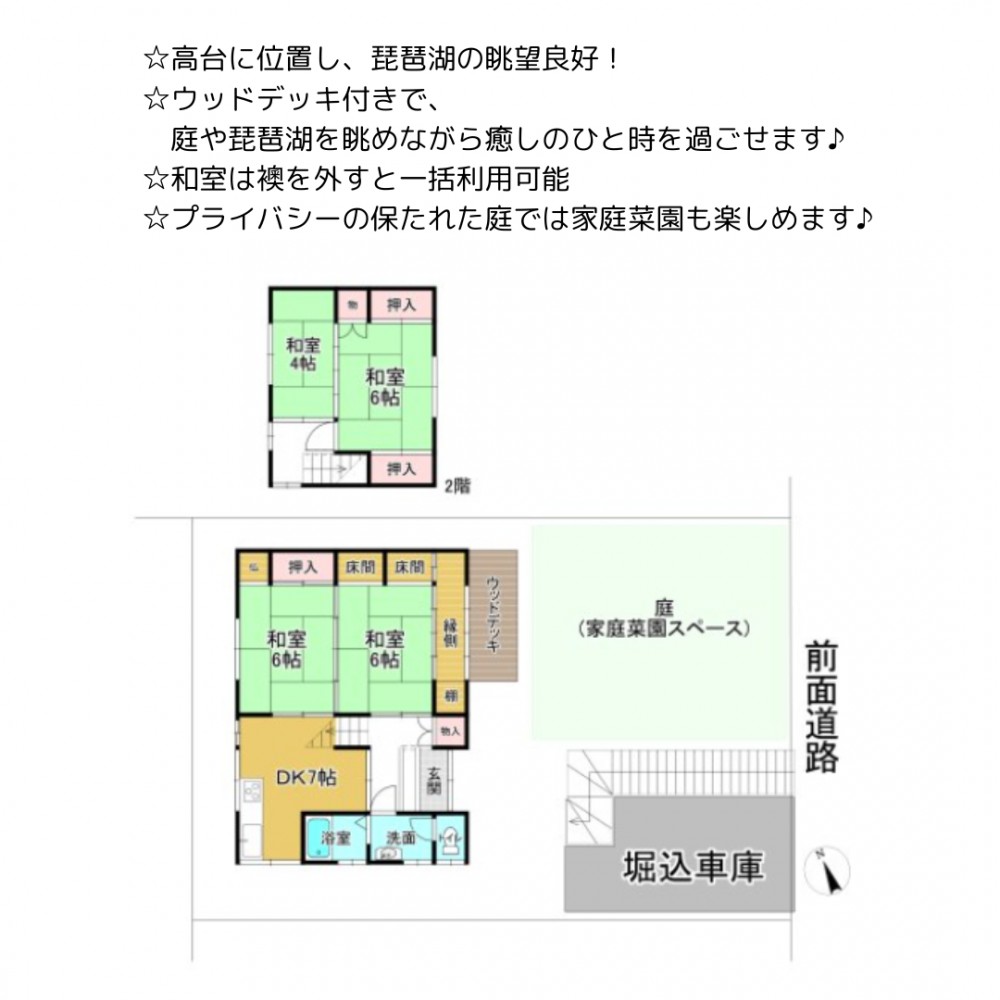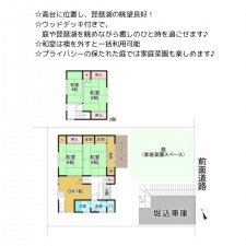 | セールスポイント | ☆高台に位置し、琵琶湖の眺望良好! ☆ウッドデッキ付きで、庭や琵琶湖を眺めながら癒しのひと時を過ごせます ☆和室は襖を外すと一括利用可能 ☆プライバシーの保たれた庭では家庭菜園も楽しめます♪ |
