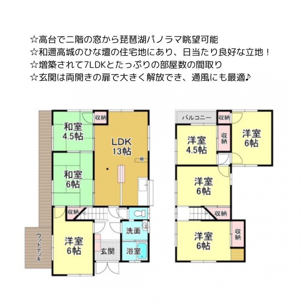 | セールスポイント | ☆高台で二階の窓から琵琶湖パノラマ眺望可能 ☆和邇高城のひな壇の住宅地にあり、日当たり良好な立地! ☆増築されて7LDKとたっぷりの部屋数の間取り ☆玄関は両開きの扉で大きく解放でき、通風にも最適♪ 【2025年12月リフォーム済み】 ・2階洋室フローリング張替 |