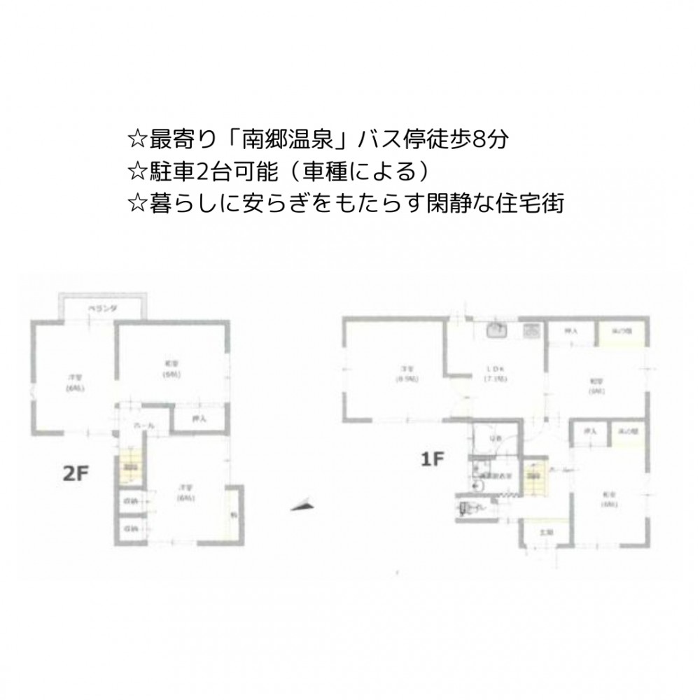 | セールスポイント | ☆最寄り「南郷温泉」バス停徒歩8分 ☆駐車2台可能(車種による) ☆暮らしに安らぎをもたらす閑静な住宅街 |
