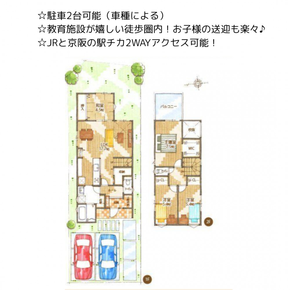 | セールスポイント | ☆駐車2台可能(車種による) ☆教育施設が嬉しい徒歩圏内!お子様の送迎も楽々♪ ☆JRと京阪の駅チカ2WAYアクセス可能! |
