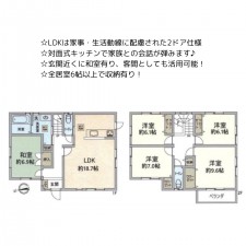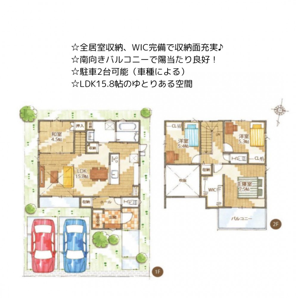 | セールスポイント | ☆全居室収納、WIC完備で収納面充実♪ ☆南向きバルコニーで陽当たり良好! ☆駐車2台可能(車種による) ☆LDK15.8帖のゆとりある空間 |