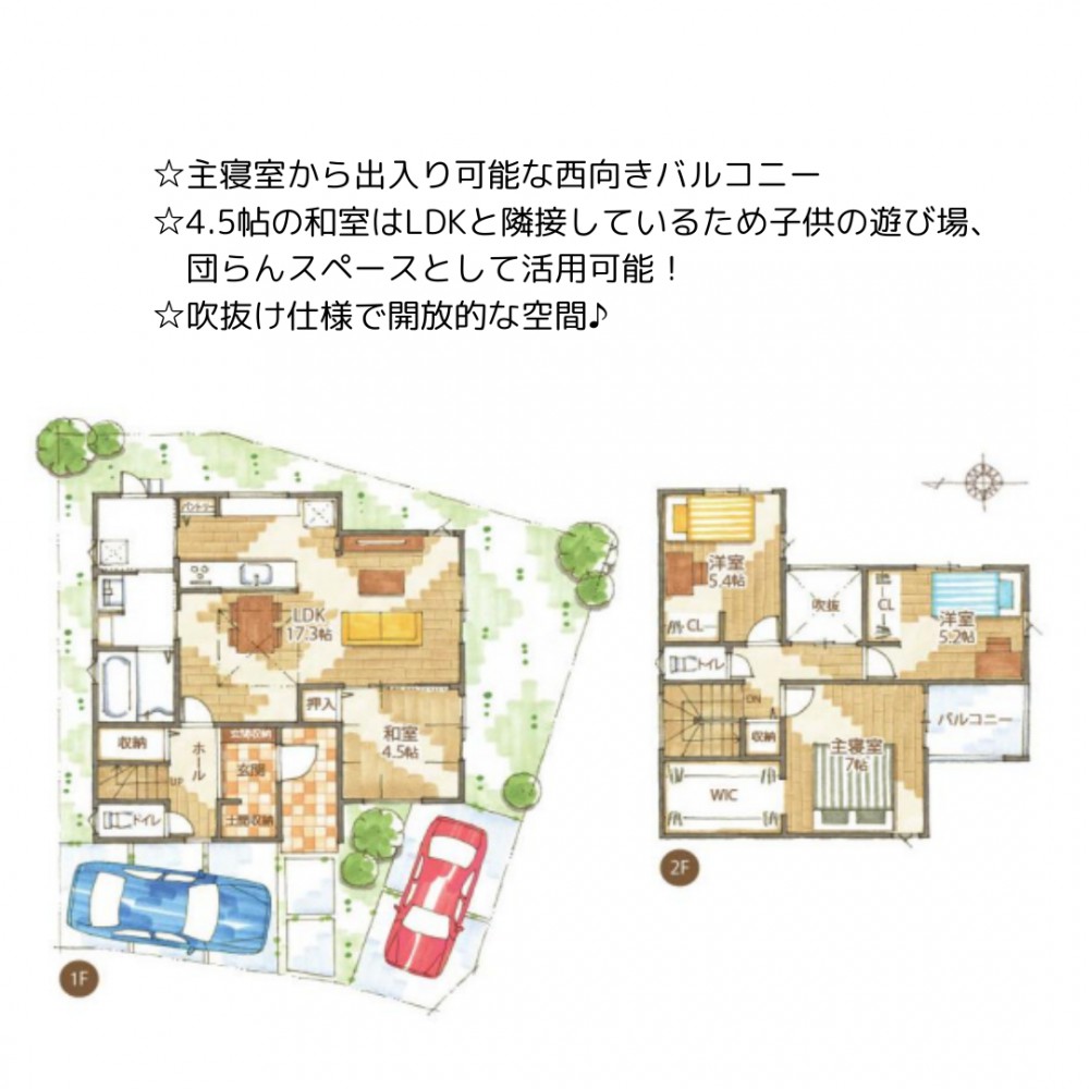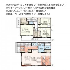 | セールスポイント | ☆主寝室から出入り可能な西向きバルコニー ☆4.5帖の和室はLDKと隣接しているため子供の遊び場、団らんスペースとして活用可能! ☆吹抜け仕様で開放的な空間♪ |
