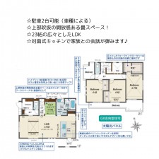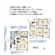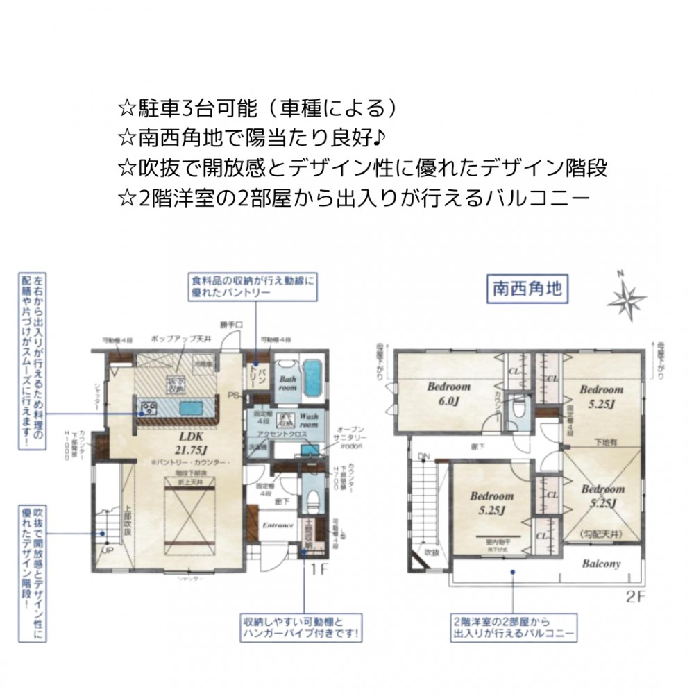 | セールスポイント | ☆駐車3台可能(車種による) ☆南西角地で陽当たり良好♪ ☆吹抜で開放感とデザイン性に優れたデザイン階段 ☆2階洋室の2部屋から出入りが行えるバルコニー |