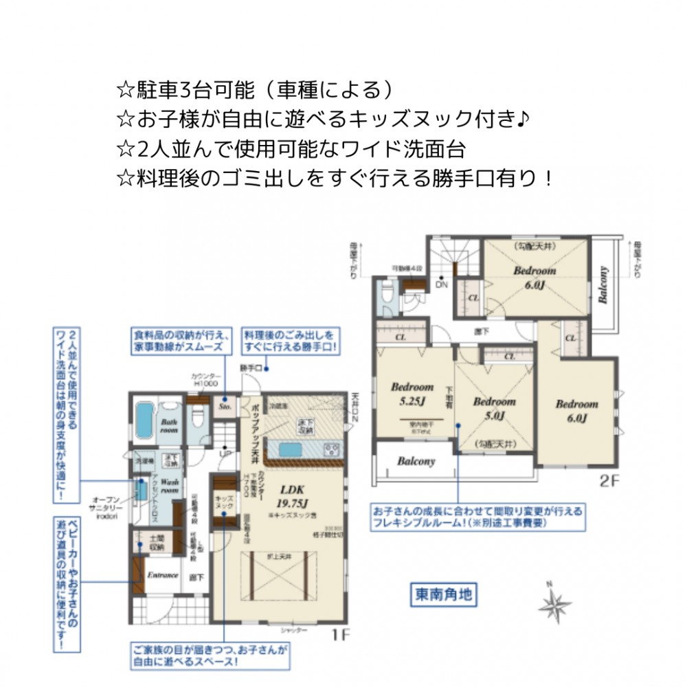 | セールスポイント | ☆駐車3台可能(車種による) ☆お子様が自由に遊べるキッズヌック付き♪ ☆2人並んで使用可能なワイド洗面台 ☆料理後のゴミ出しをすぐ行える勝手口有り! |