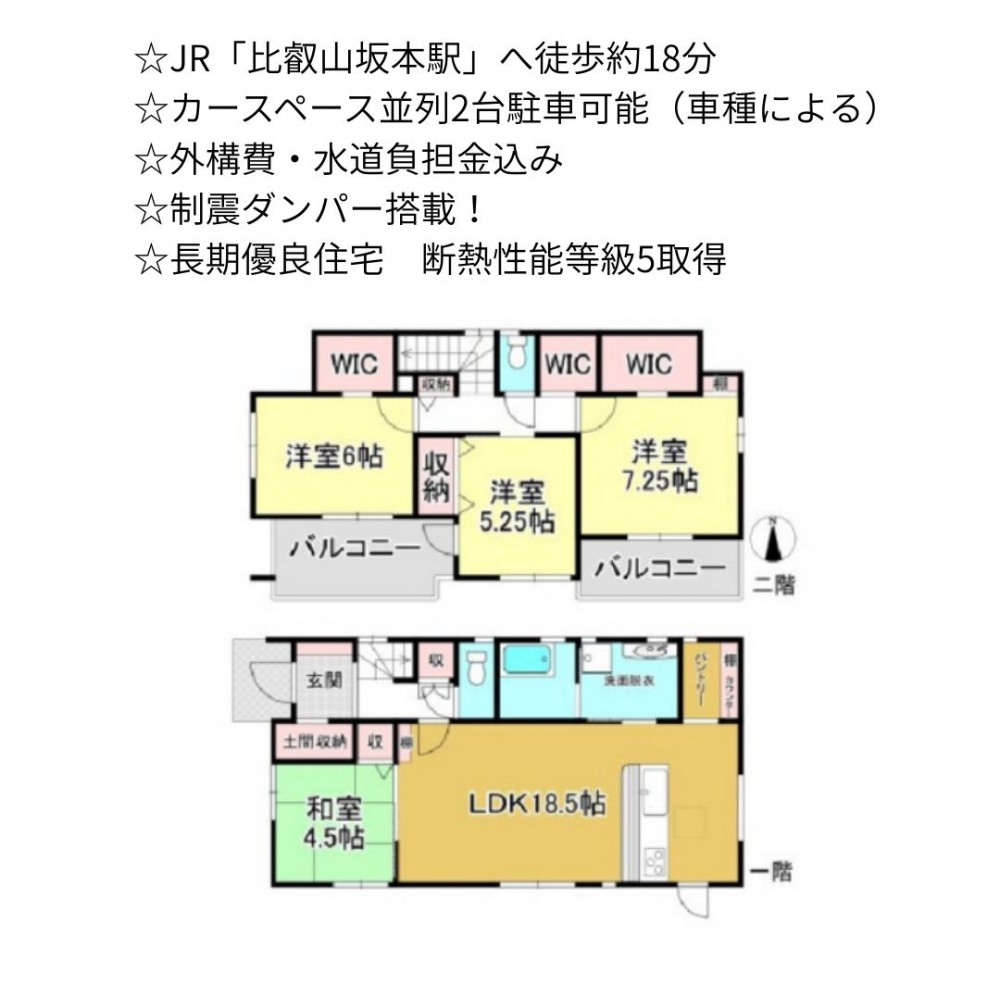 | セールスポイント | ☆JR「比叡山坂本駅」へ徒歩約18分 ☆カースペース並列2台駐車可能(車種による) ☆外構費・水道負担金込み ☆制震ダンパー搭載! ☆長期優良住宅 断熱性能等級5取得 |