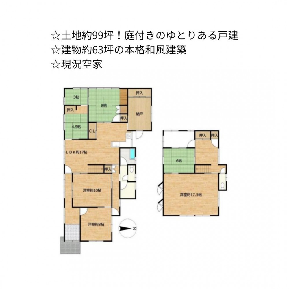 | セールスポイント | ☆土地約99坪!庭付きのゆとりある戸建 ☆建物約63坪の本格和風建築 ☆現況空家 |
