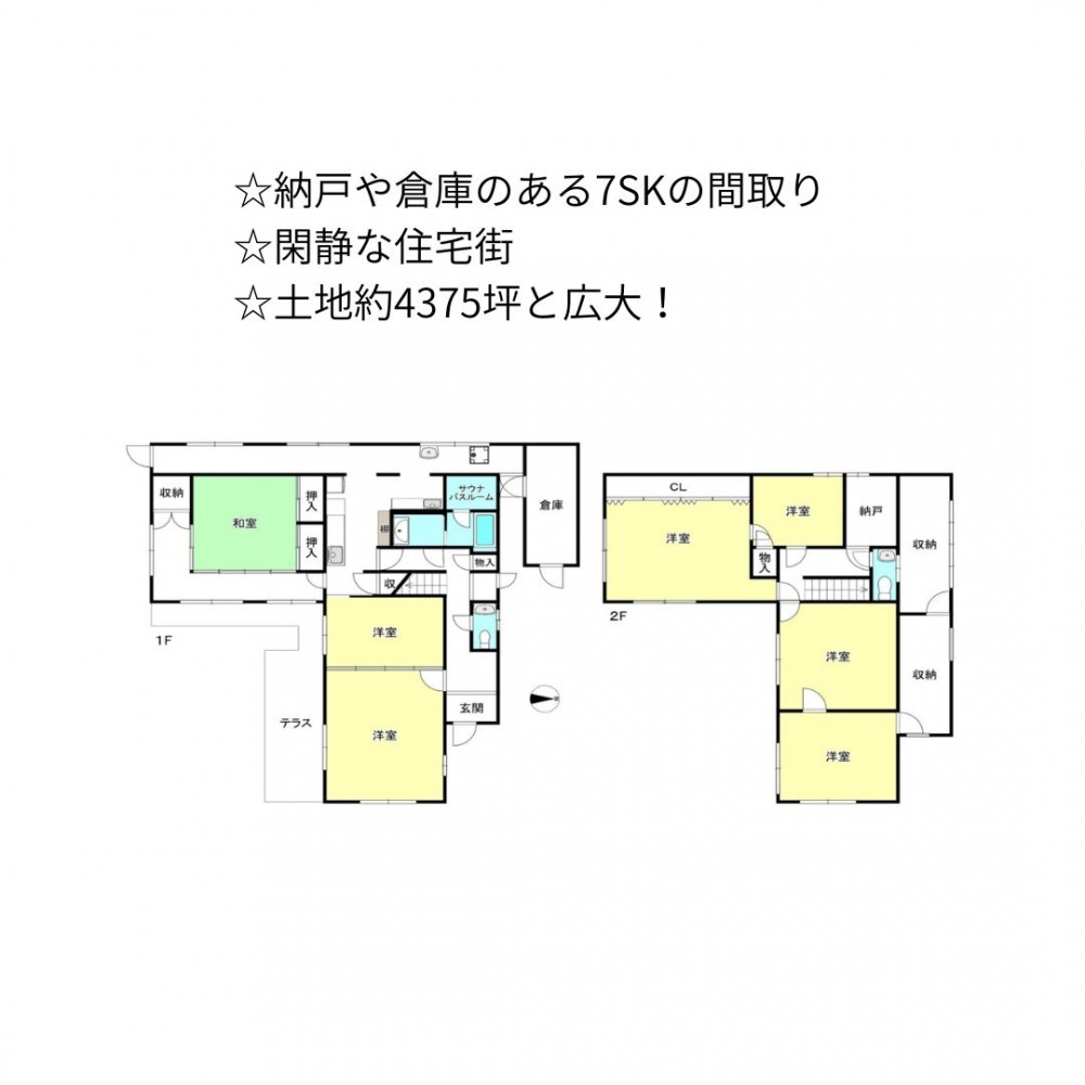 | セールスポイント | ☆納戸や倉庫のある7SKの間取り ☆閑静な住宅街 ☆土地約4375坪と広大! |