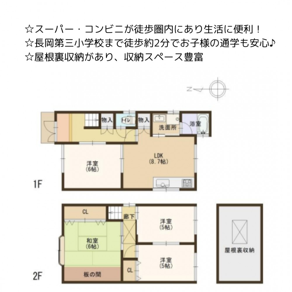 | セールスポイント | ☆スーパー・コンビニが徒歩圏内にあり生活に便利! ☆長岡第三小学校まで徒歩約2分でお子様の通学も安心♪ ☆屋根裏収納があり、収納スペース豊富 |