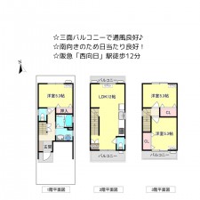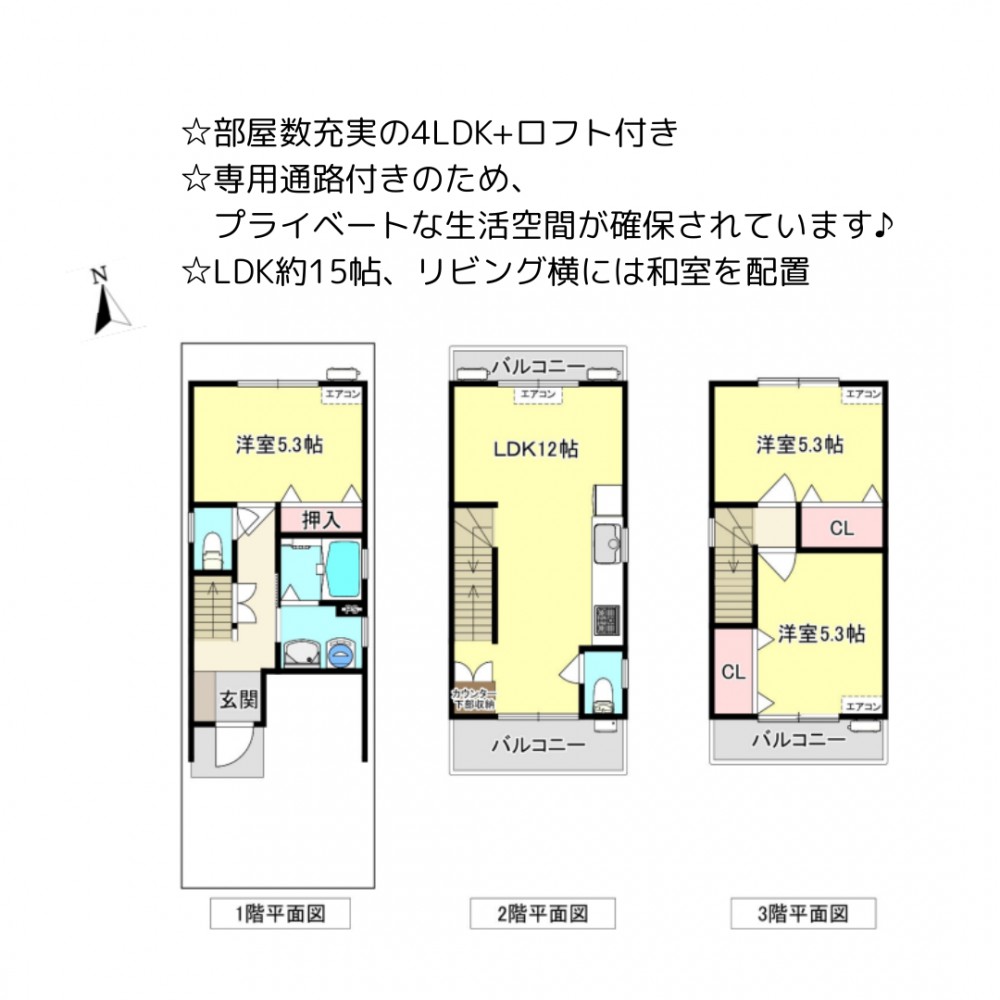 | セールスポイント | ☆部屋数充実の4LDK+ロフト付き ☆専用通路付きのため、プライベートな生活空間が確保されています♪ ☆LDK約15帖、リビング横には和室を配置 |