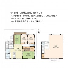 | セールスポイント | ☆1階用、2階用の玄関2ヶ所有り! ☆2F事務所、作業所、趣味の部屋として利用可能♪ ☆駐車2台可能(車種による) ☆前面道路幅員広々で駐車が楽々! |