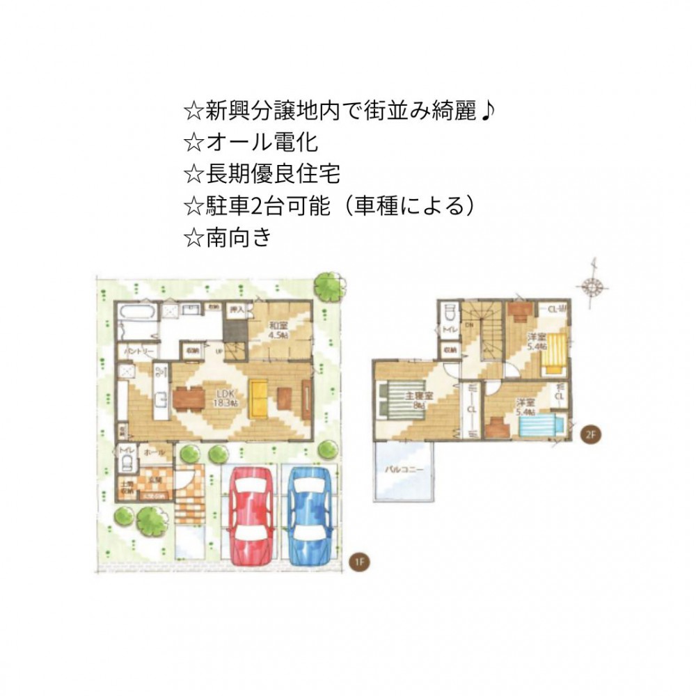 | セールスポイント | ☆新興分譲地内で街並み綺麗♪ ☆オール電化 ☆長期優良住宅 ☆駐車2台可能(車種による) ☆南向き |
