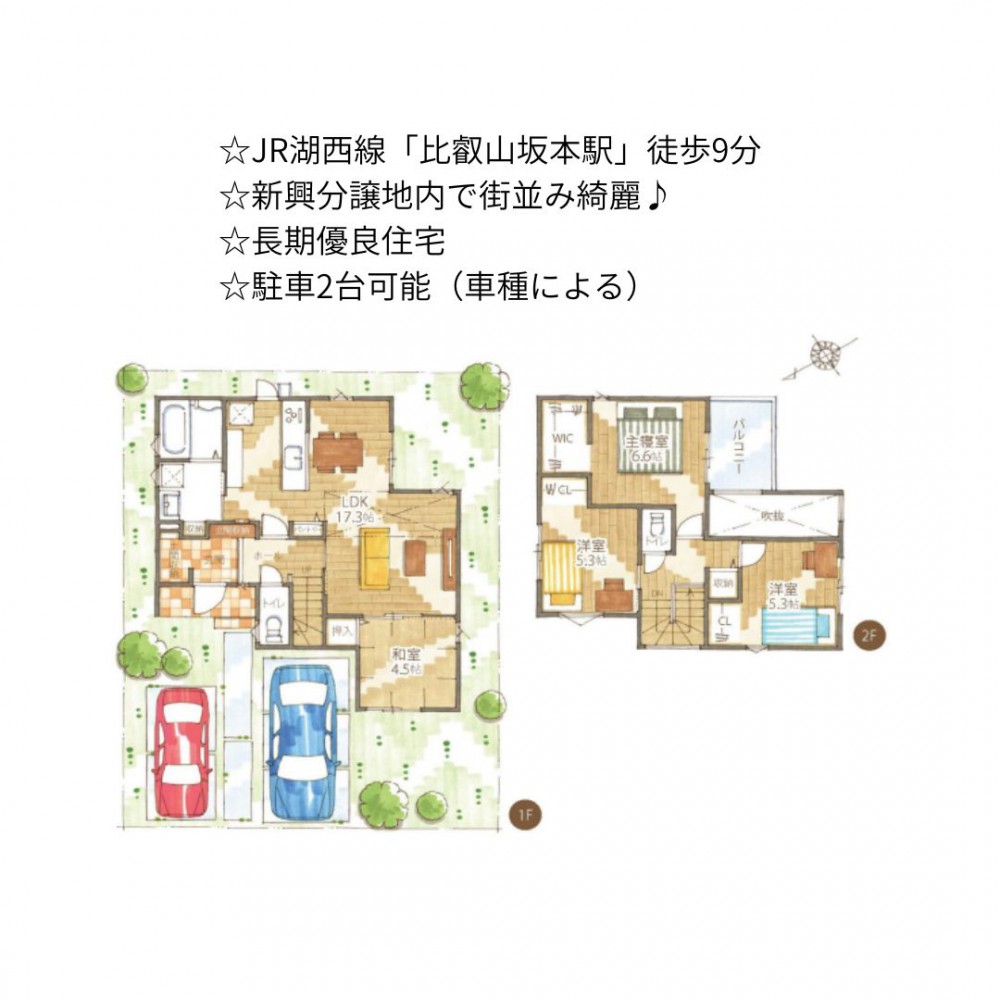 | セールスポイント | ☆JR湖西線「比叡山坂本駅」徒歩9分 ☆新興分譲地内で街並み綺麗♪ ☆長期優良住宅 ☆駐車2台可能(車種による) |
