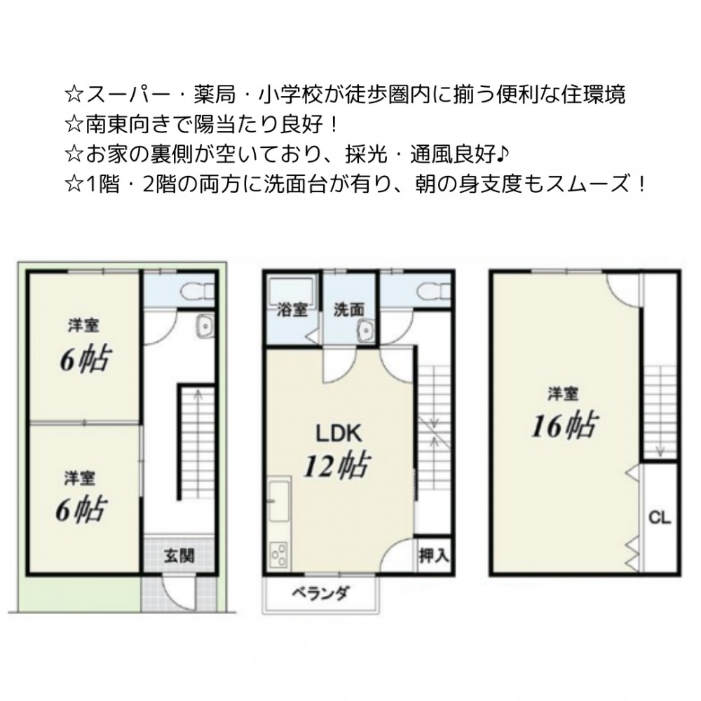 | セールスポイント | ☆スーパー・薬局・小学校が徒歩圏内に揃う便利な住環境 ☆南東向きで陽当たり良好! ☆お家の裏側が空いており、採光・通風良好♪ ☆1階・2階の両方に洗面台があり朝の身支度もスムーズ! |