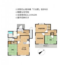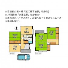 | セールスポイント | ☆京阪石山坂本線「穴太駅」徒歩9分 ☆閑静な住宅街 ☆全居室6帖以上の4LDK ☆屋外収納付き |