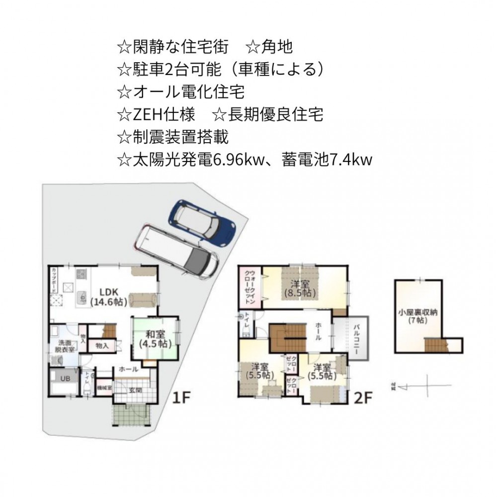 | セールスポイント | ☆閑静な住宅街 ☆角地 ☆駐車2台可能(車種による) ☆オール電化住宅 ☆ZEH仕様 ☆長期優良住宅 ☆制震装置搭載 ☆太陽光発電6.96kw、蓄電池7.4kw |