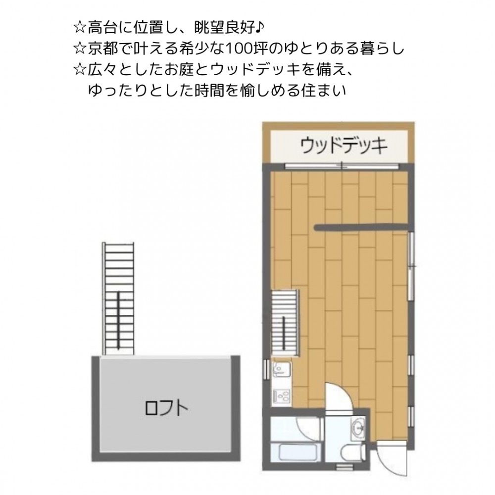 | セールスポイント | ☆高台に位置し、眺望良好♪ ☆京都で叶える希少な100坪のゆとりある暮らし ☆広々としたお庭とウッドデッキを備え、ゆったりとした時間を愉しめる住まい |