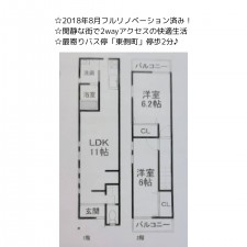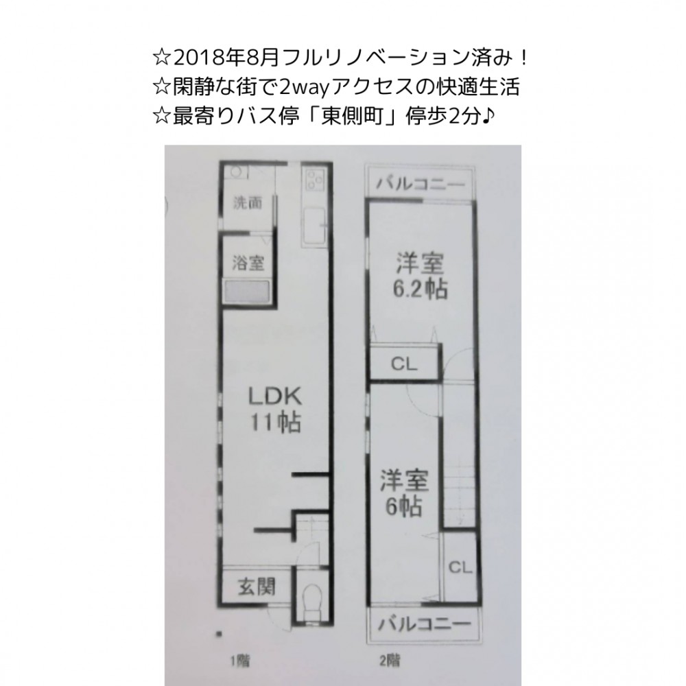 | セールスポイント | ☆2018年8月フルリノベーション済み! ☆閑静な街で2wayアクセスの快適生活 ☆最寄りバス停「東側町」停歩2分♪ |