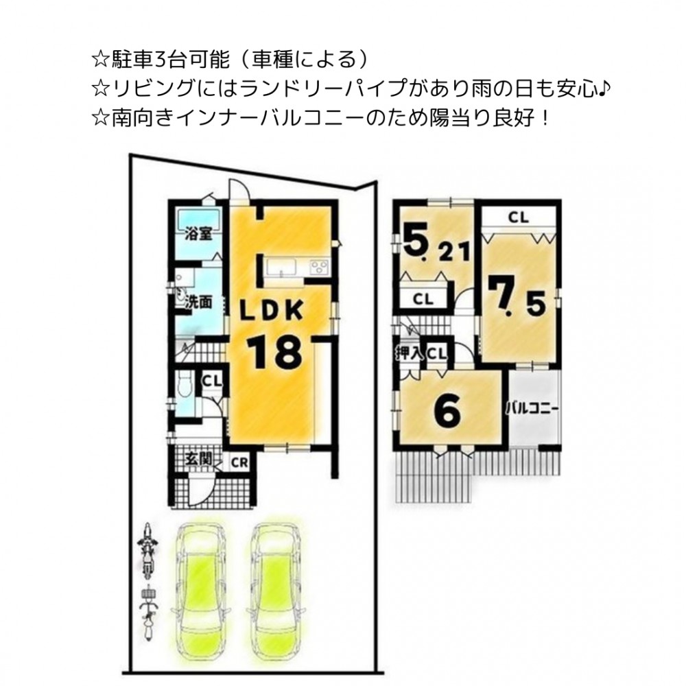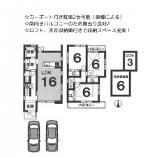 | セールスポイント | ☆駐車3台可能(車種による) ☆リビングにはランドリーパイプがあり雨の日も安心♪ ☆南向きインナーバルコニーのため陽当り良好! |