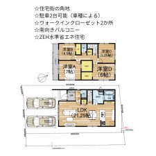 | セールスポイント | ☆住宅街の角地 ☆駐車2台可能(車種による) ☆ウォークインクローゼット2か所 ☆南向きバルコニー ☆ZEH水準省エネ住宅 |