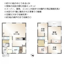 | セールスポイント | ☆スーパー、薬局、コンビニが徒歩10分圏内で周辺環境充実♪ ☆約19.5帖のゆとりあるLDK ☆家族の会話が弾む対面キッチン♪ ☆水回りが1階に集約された家事ラク動線 ☆玄関SC付きで収納充実! ☆約3帖の納戸付きで収納力◎ |