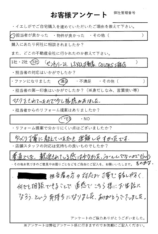 A.担当者の方の対応が丁寧で話しやすく、何でも相談できることで直感でこちら様にお世話になろうという気持ちになりました。ありがとうございました。