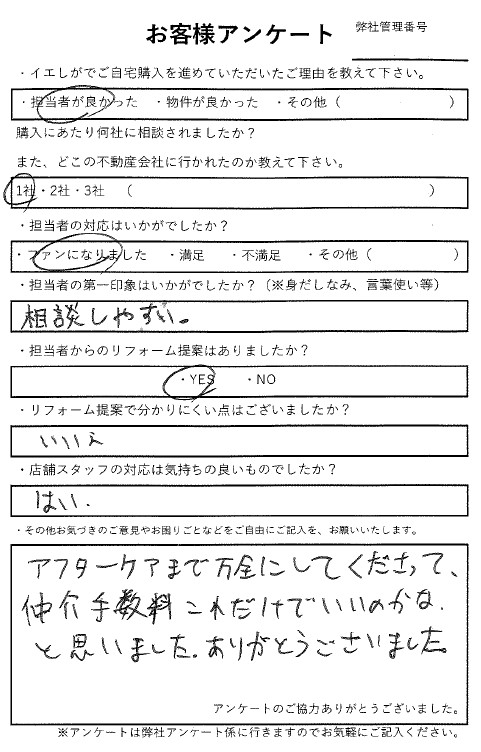 A.アフターケアまで万全にしてくださって、仲介手数料これだけでいいのかなと思いました。ありがとうございました。